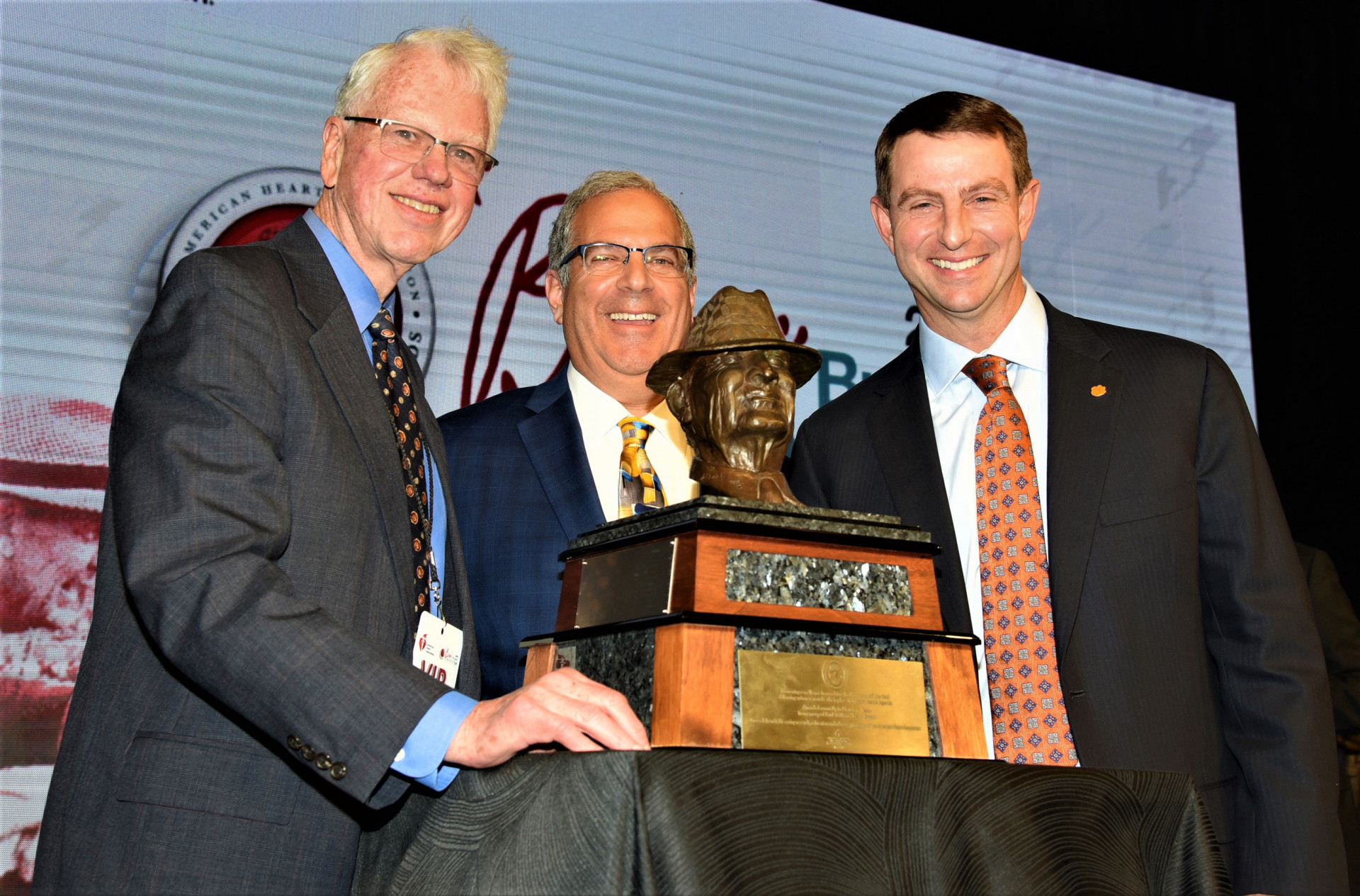 From left, NSMA board member Bob Ryan, NSMA executive director Dave Goren and 3-time Bear Bryant Coach of the Year Dabo Swinney